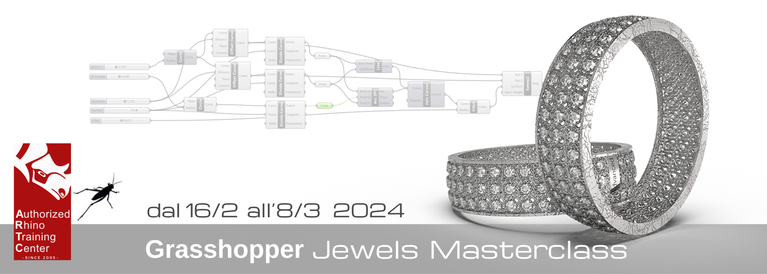 Grasshopper è un editor di algoritmi grafici, integrato in Rhino, che permette la gestione parametrica dei progetti.Con Grasshopper è possibile organizzare la progettazione, per creare soluzioni di forme e di elementi modificabili e aggiornabili in tempo reale.PERCHÉ UNA MASTERCLASS DI GRASSHOPPER PER IL GIOIELLOQuesta Masterclass è un corso specifico che affronta situazioni tipiche della progettazione di gioielli.I vantaggi di imparare a usare Grasshopper per il gioiello sono almeno tre:• Grasshopper risolve i problemi di modifica delle forme e delle misure che, nella progettazione di gioielli, sia singoli sia in serie, è frequentemente richiesta